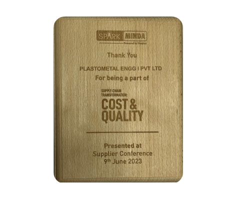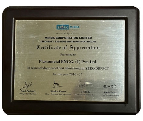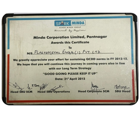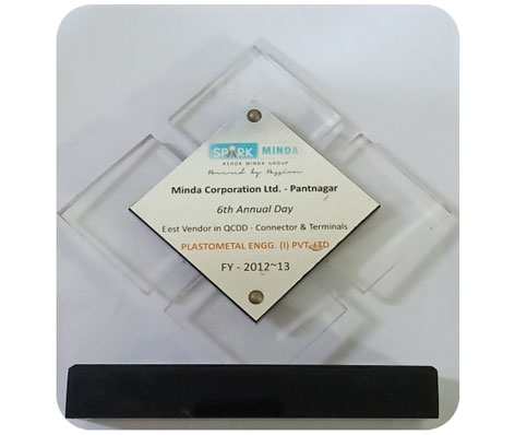 Plastometal Engg has been recognized as ‘The Best Vendor in QCDD (Quality, Cost, Delivery, Development) for Connector & Terminals’ by Spark Minda. This esteemed award, conferred upon Plastometal Engg for its exceptional performance in the year 2013, highlights the company's unwavering commitment to excellence across all aspects of its operations