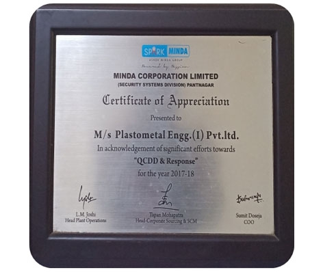 Plastometal Engg (I) Pvt Ltd. has been honored with the prestigious "QCDD & Response" award by Spark Minda for the year 2017~18. This esteemed recognition underscores Plastometal 's remarkable contributions and tireless efforts in the realms of Quality, Cost, Delivery, and Development, alongside an exceptional aptitude for responsive action.