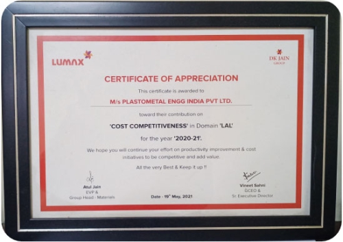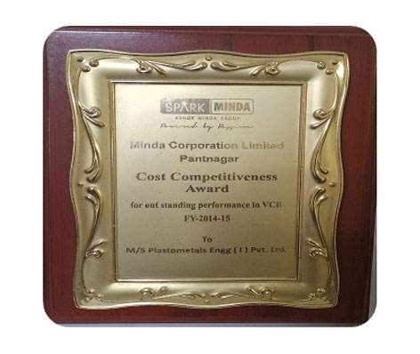 Plastometal Engg, a distinguished name in the automotive sector, has been honored for its outstanding performance in ‘COST COMPETITIVENESS’ by Spark Minda. The esteemed award, recognizing Plastometal Engg's remarkable achievements during the years 2014-2015, underscores the company's commitment to delivering value while maintaining competitiveness in the market.