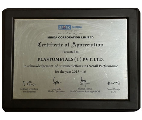 Plastometal Engg, a renowned player in the automotive sector, has been recognized for its “SUSTAINED EXCELLENCE IN OVERALL PERFORMANCE” by Spark Minda, a leader in the industry. The prestigious award, presented to Plastometal Engg for its exemplary efforts during the years 2015-2016, highlights the company's unwavering commitment to excellence across all facets of its operations