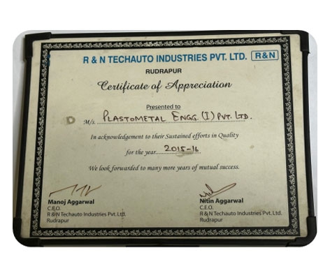 Plastometal Engg, a leading player in the automotive industry, has been honored with the prestigious "Sustained Efforts in Quality" awarded by R&TECHAUTO, Rudrapur. This esteemed recognition, covering the period of 2015 ~ 2016, highlights the company's unwavering commitment to delivering excellence in its products quality.